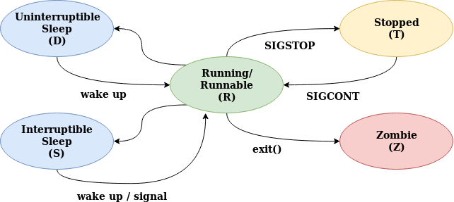 R: running or runnable (on run queue)D: uninterruptible sleepS: interruptible sleep (waiting for an event to complete)T: stopped by job control signalZ: defunct ("zombie") process, terminated but not reaped by its parentImage from https://cloudchef.medium.com/linux-process-states-and-signals-a967d18fab64