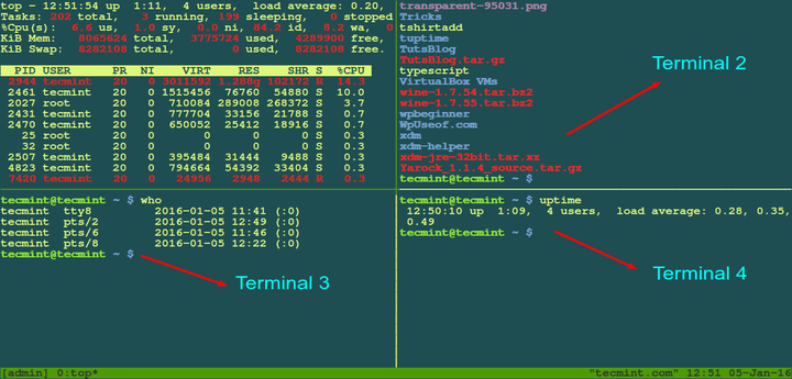 Image from https://www.tecmint.com/tmux-to-access-multiple-linux-terminals-inside-a-single-console/