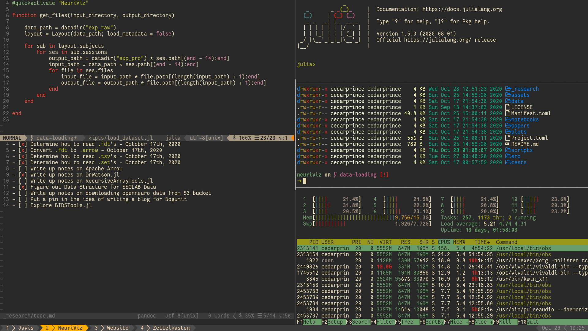 A tmux window with htop on the top, directory listing on bottom left and JavaScript file opened in vim on bottom right. Image from https://www.futurehosting.com/blog/tmux-is-a-server-administration-essential/