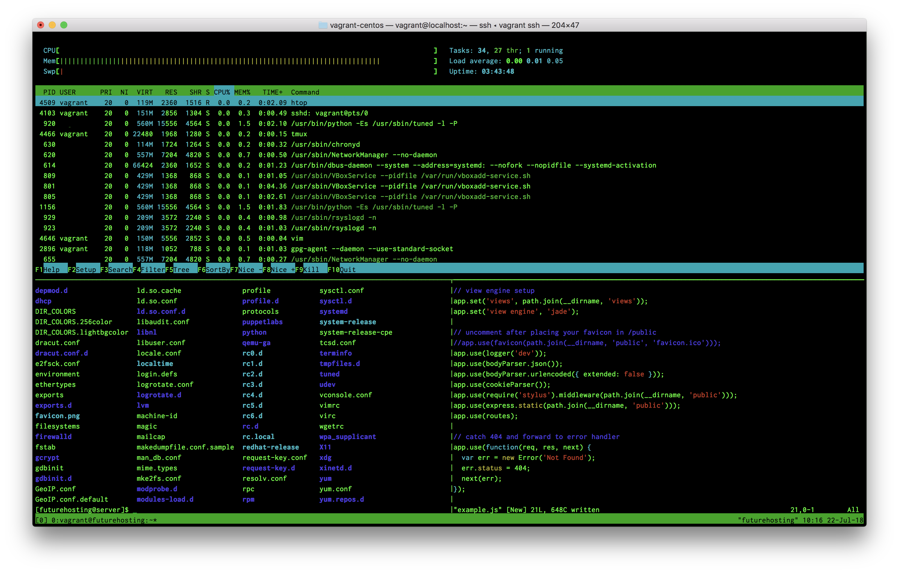 A tmux window with htop on the top, directory listing on bottom left and JavaScript file opened in vim on bottom right. Image from https://www.futurehosting.com/blog/tmux-is-a-server-administration-essential/